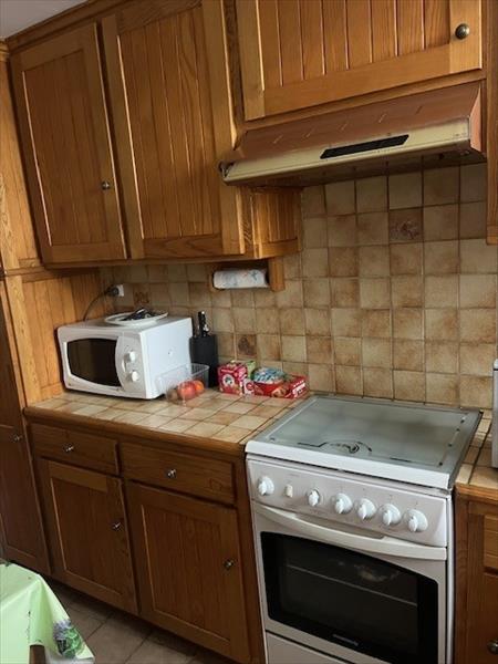 Un séjour avec cheminée, une cuisine équipée, un hall avec rangement desservant une salle de bain avec WC.