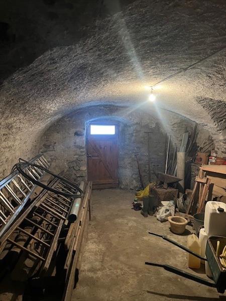 Une cave voûtée avec accès à un jardin, et une autre petite cave en terre battue.